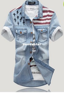 denim shirt top pop korea style flag vintage denim tops men short sleeve Slim wear white washed denim tide